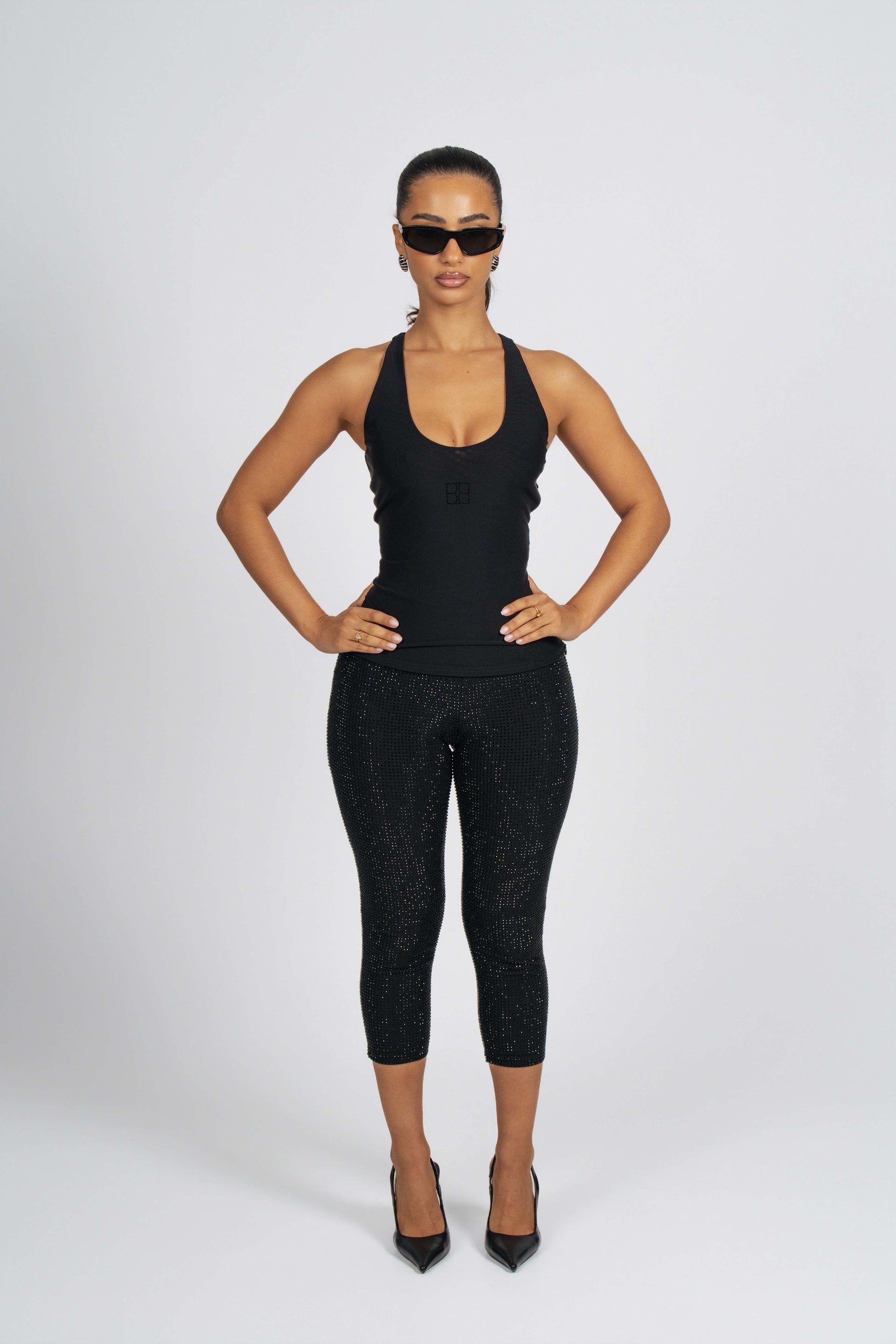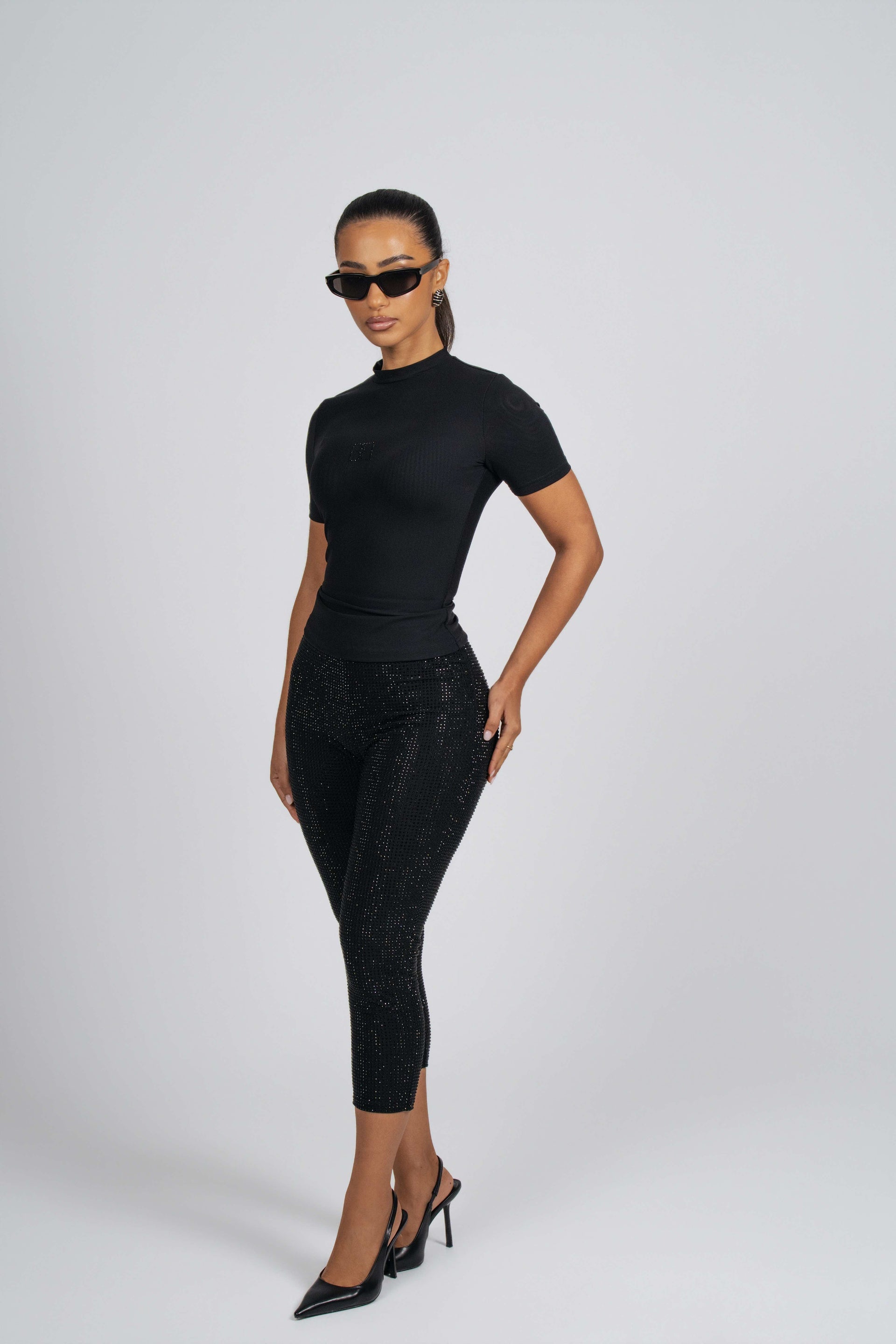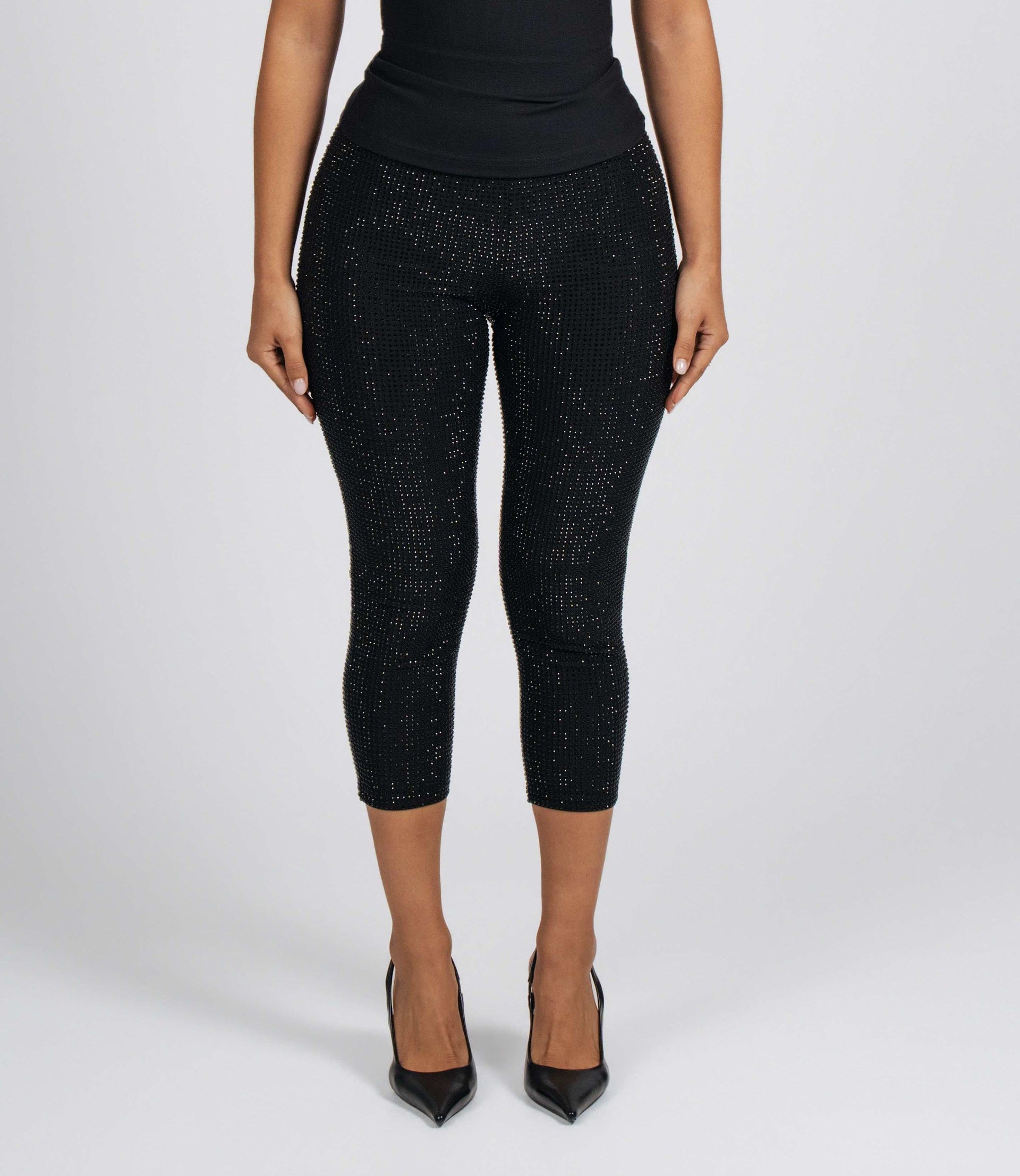 Get ready to  give those legs the spotlight they deserve in our rhinestone capris!  Designed with a high-waisted elastic band to accentuate your waist, these sparkly capris are guaranteed to keep you shining all night. Style with any of our Binwa logo tops.