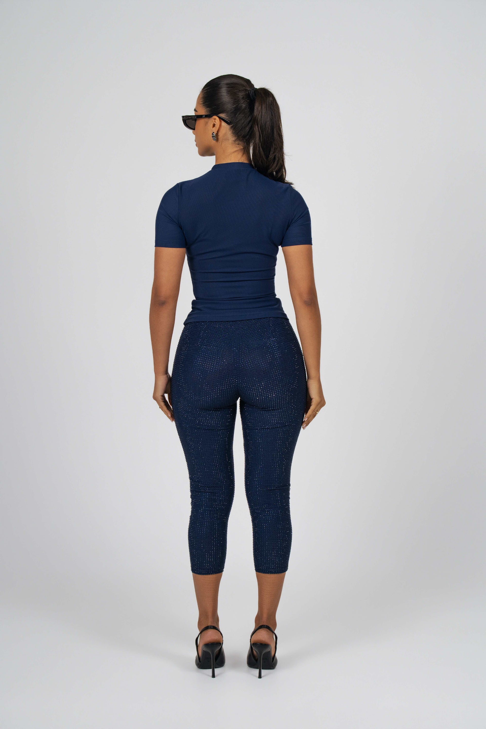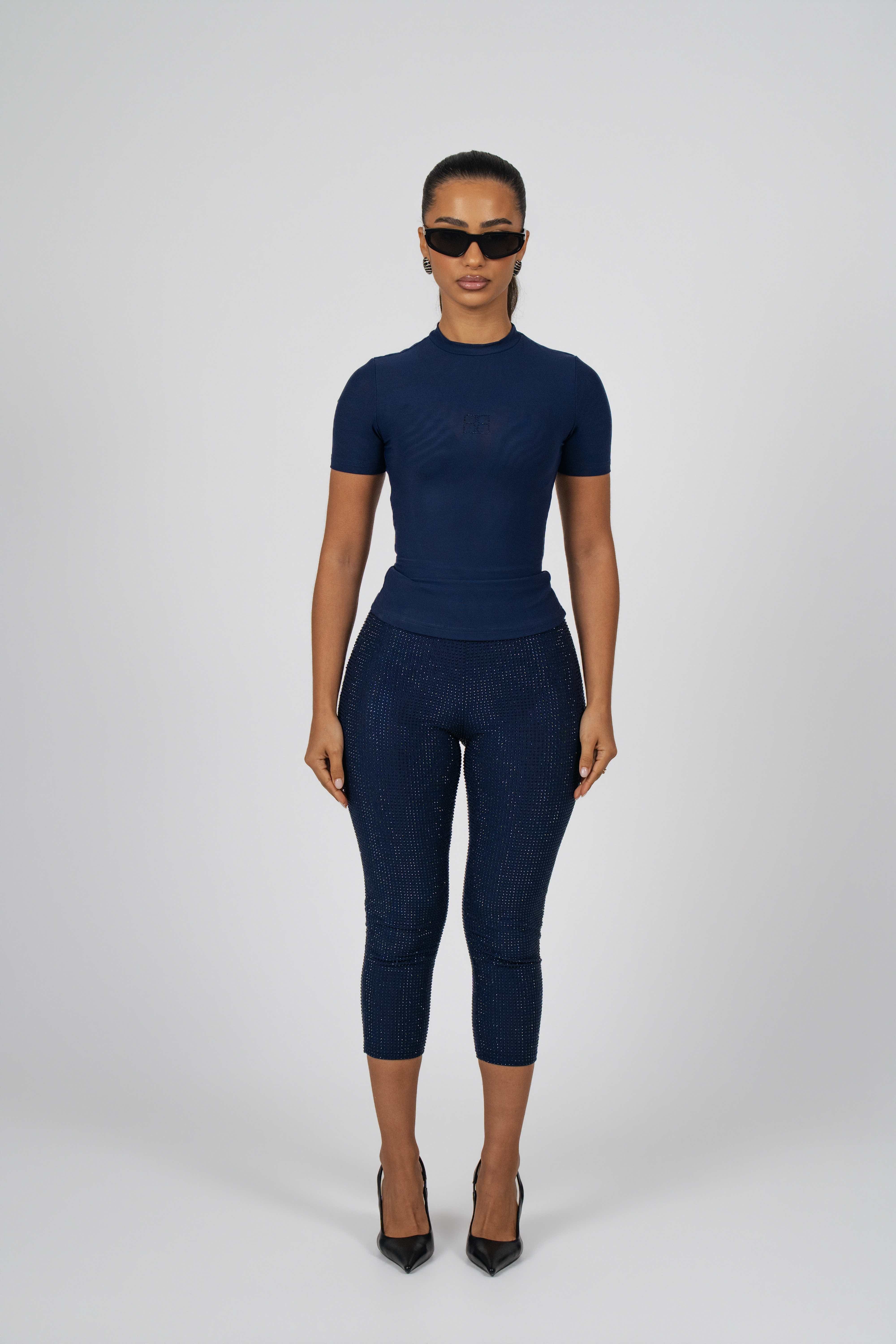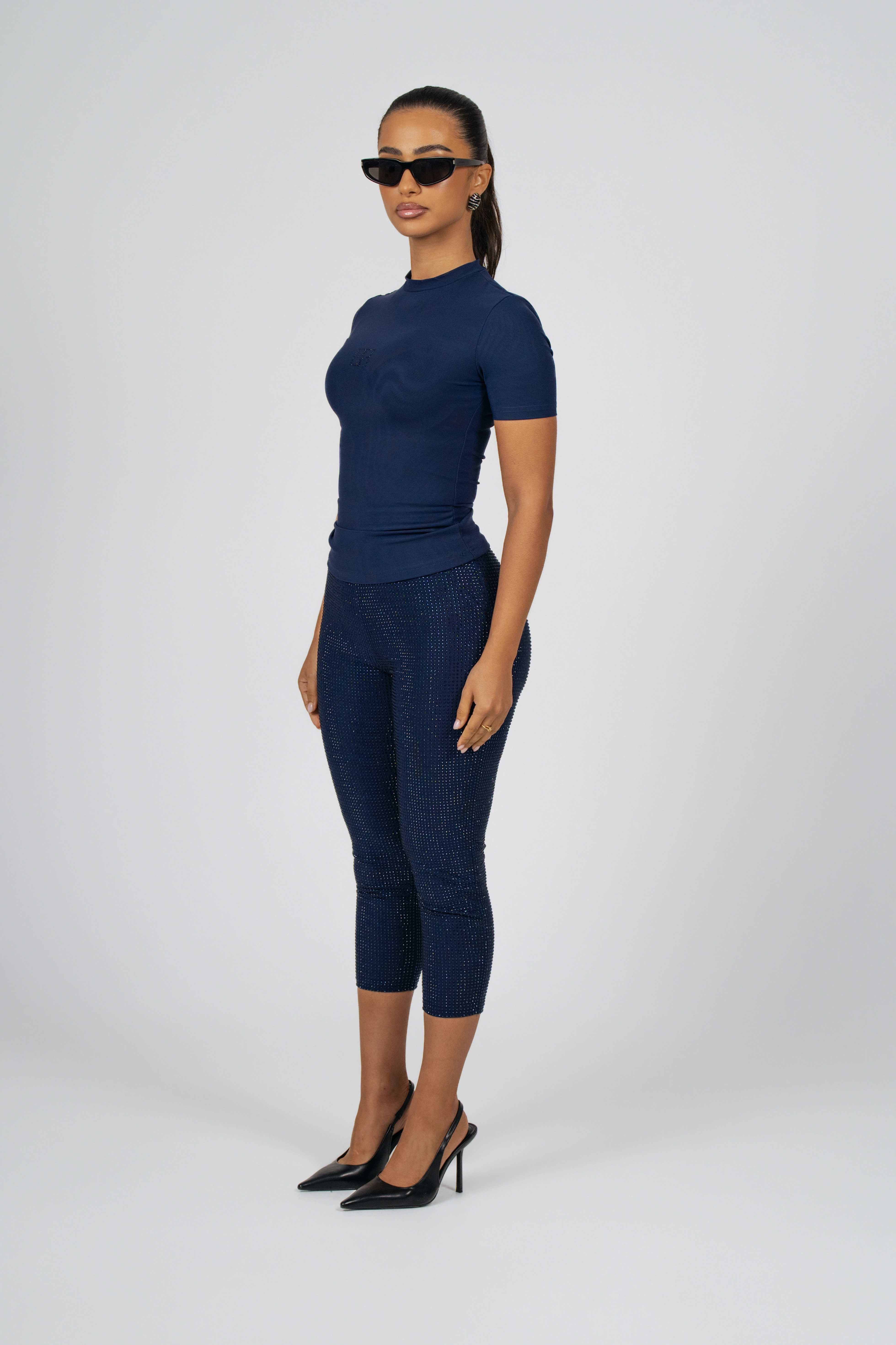 This crew neck short sleeve top is crafted from our signature mesh fabric, featuring a snatched silhouette. The crystal logo at the center adds a touch of sophistication, elevating the design with its understated shine.
