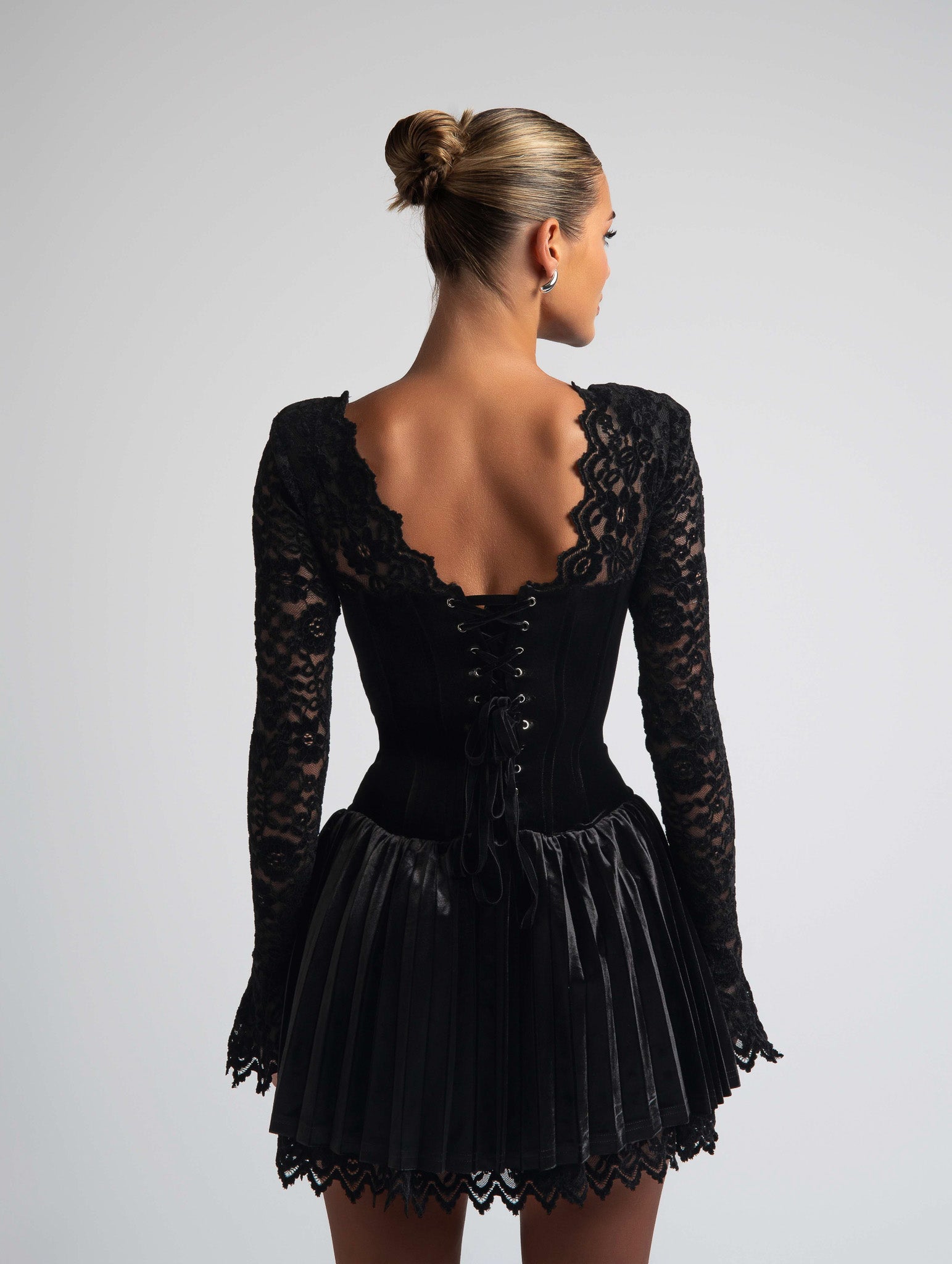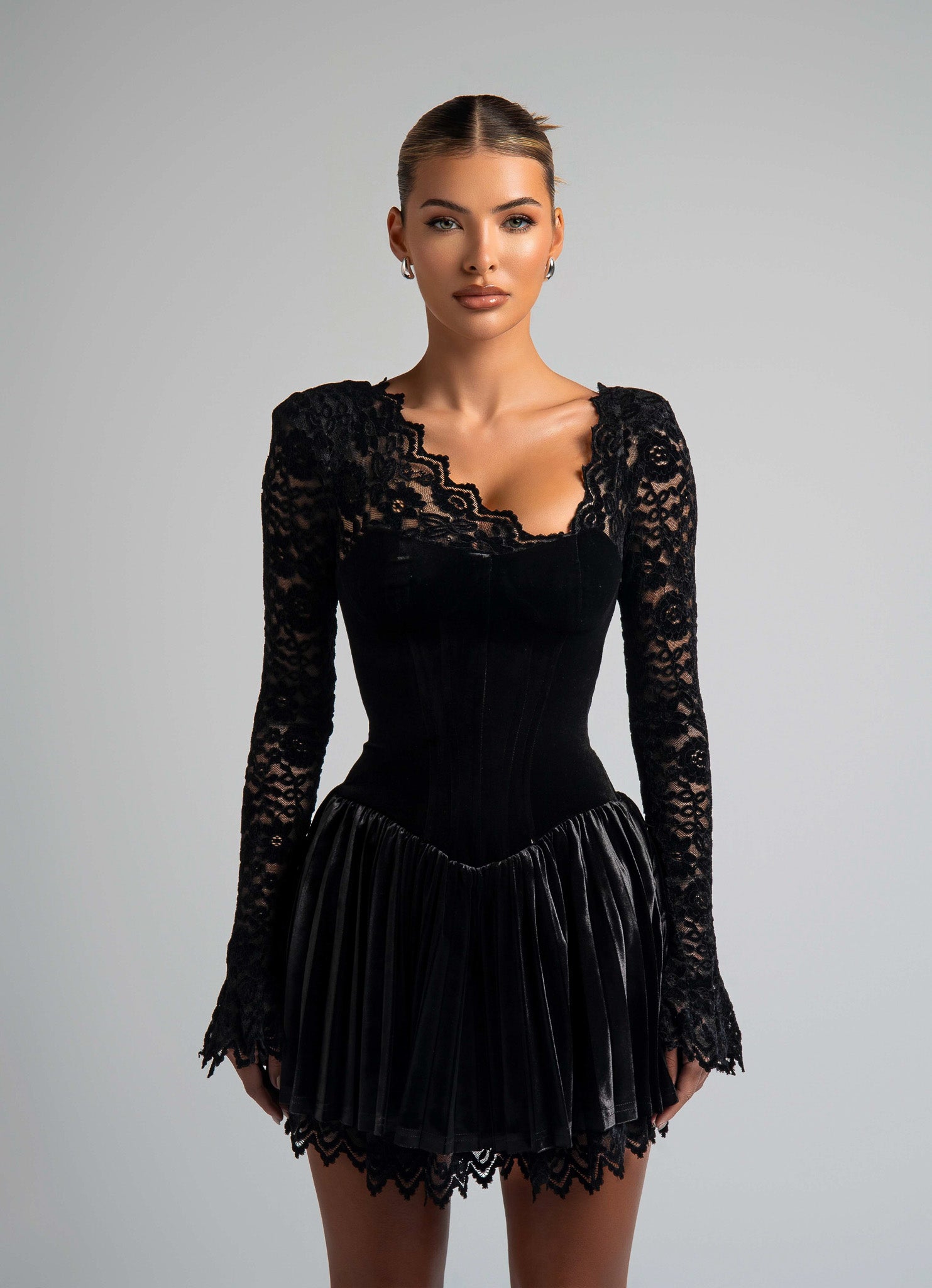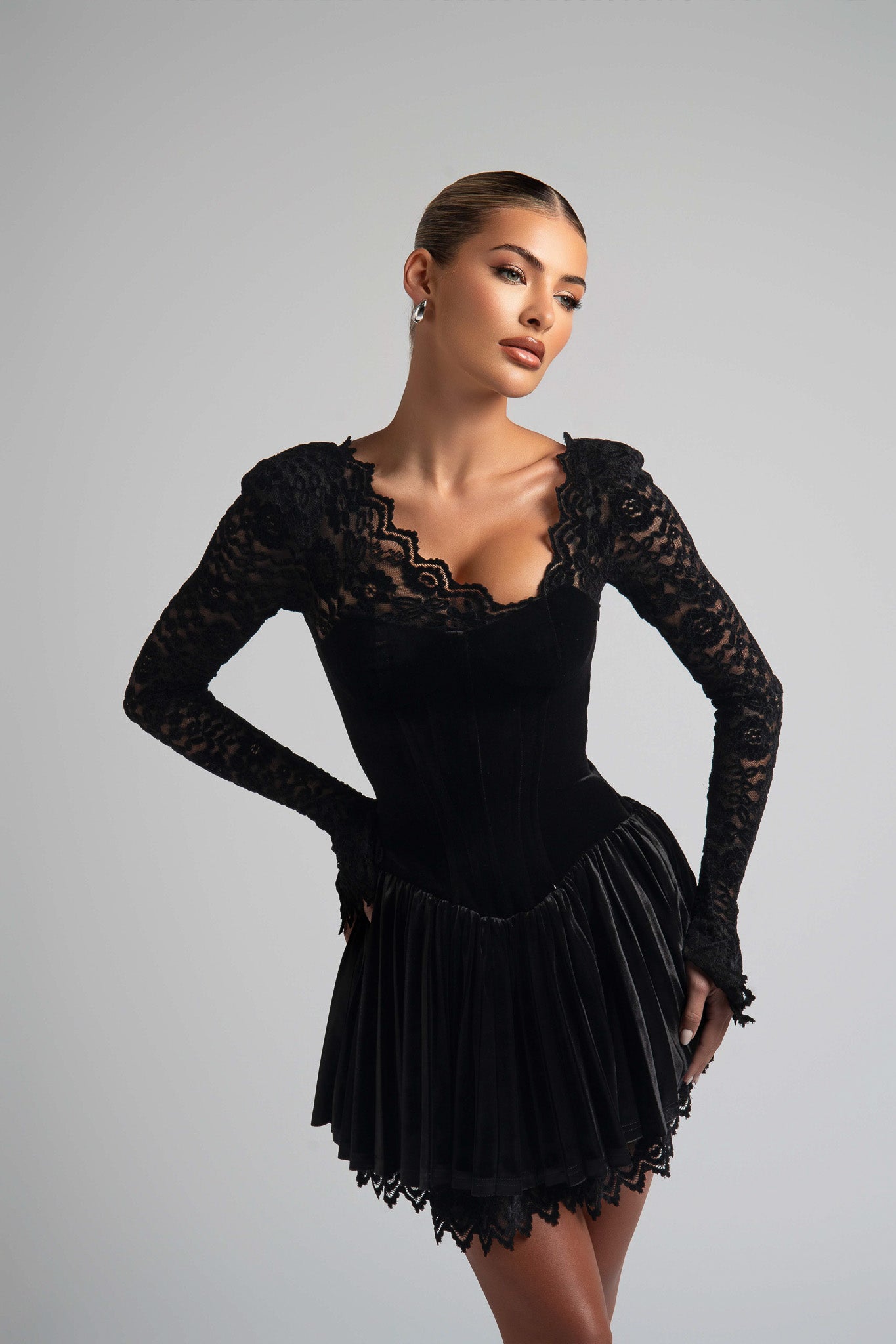 Take your style to the next level with our killer velvet and lace mini dress, featuring a bold, eye-catching design. This head-turning piece combines soft, stretchy velvet fabric with intricate lace details, creating a truly unforgettable look. The corseted bodice and flared mini skirt add a touch of drama and flair. The pleated mini skirt, complete with lace-trimmed details and layers of tulle and lining, adds a touch of whimsy and romance.