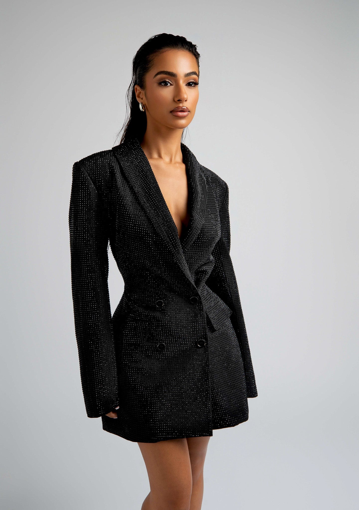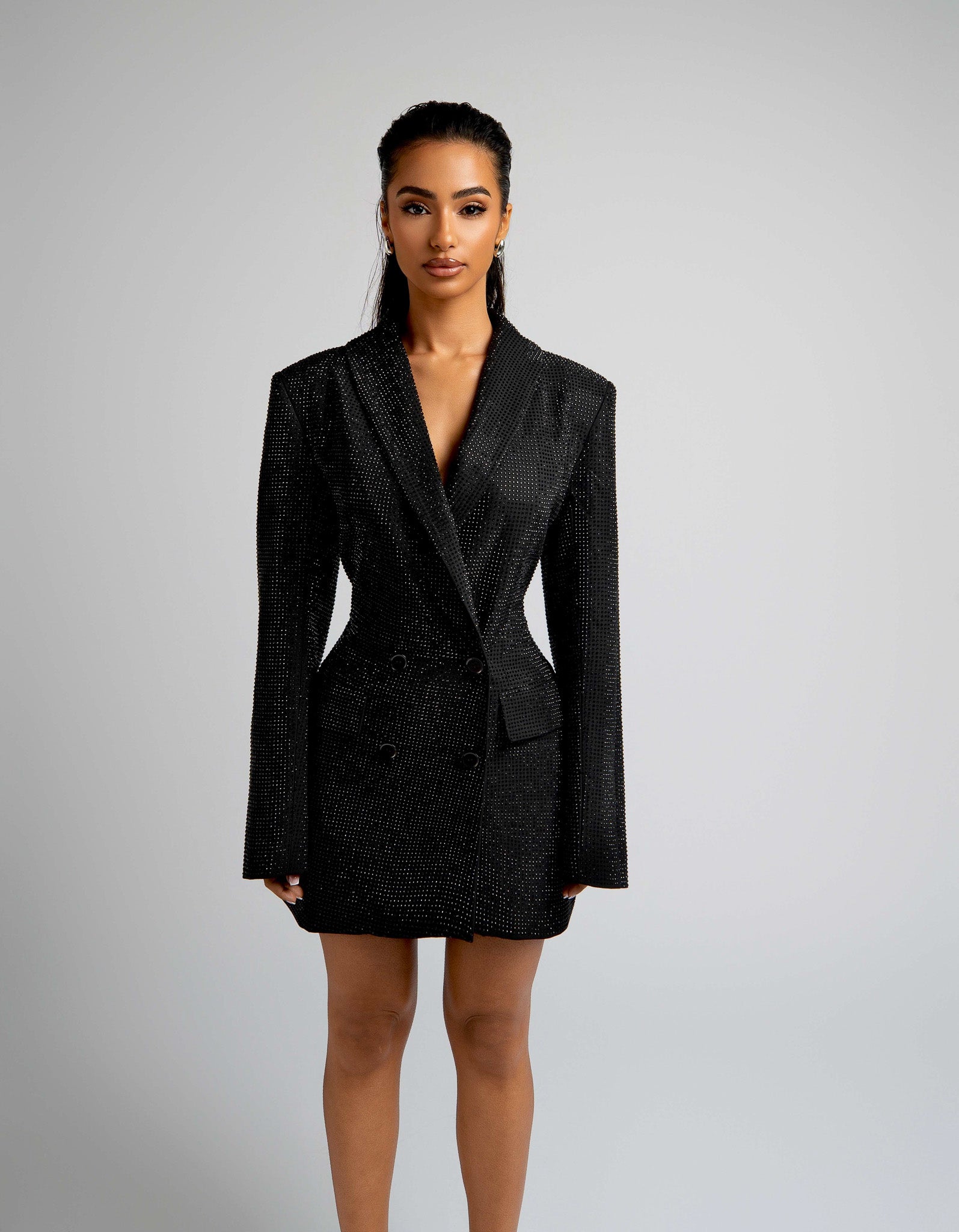 Make a statement with our exquisite custom-stoned double-breasted mini blazer, expertly designed to turn heads. Featuring a double-breasted silhouette, cinched waist, and A-line cut, this blazer creates a flawless slim waist illusion. Shoulder pads add structure, while slightly baggy sleeves lend a relaxed, effortless charm.
